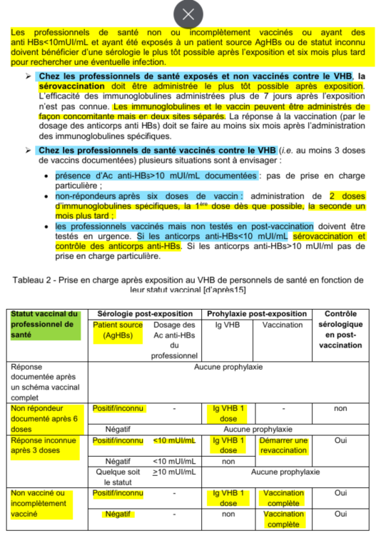 Pour les personnes non répondeuses à la vaccination, une injection d’immunoglobulines spécifiques par voie intramusculaire est indiquée, lorsque le patient source est infecté par le VHB (antigène HBs positif) ; cette injection n’est pas nécessaire lorsque l’ADN du VHB est indétectable chez le patient source, et que le traitement post-exposition comporte du ténofovir disoproxil fumarate ou du ténofovir alafénamide. La posologie est de 500 UI, la délivrance uniquement hospitalière, l’injection se fait dans un délai de 72 heures (voire 1 semaine après l’exposition), et nécessite une surveillance clinique de 30 minutes (rares réactions d’hypersensibilité).